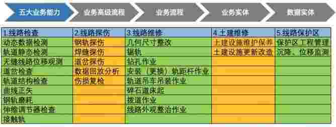 在轨道运维业务中,,,,,,,,,,,,我们形成了完整的从业务能力(业务域)-业务流程-业务实体-数据模型的分析梳理过程。。。。。。。。。。。。。轨道运维业务能力如下图所示::::::::