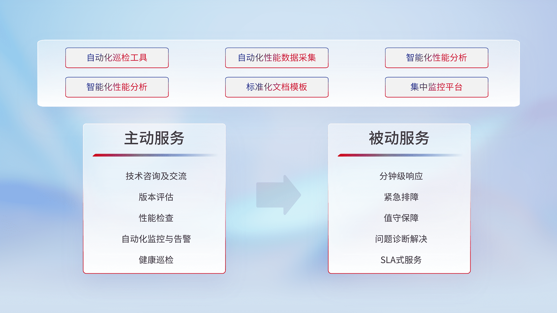 智能化工具和标准化文档,,,保障服务质量,,,,提供主动服务(包含技术咨询、、、版本评估、、、性能检查、、、自动化监控与告警、、、健康巡检)和被动服务包含(分钟级响应、、、、紧急排障、、、值守保障、、问题诊断解决、、、、SLA服务)。。。。